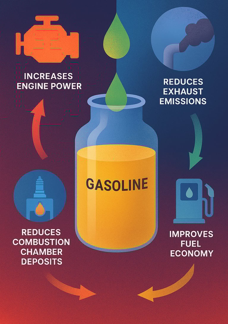 By increasing the fuel’s octane/cetane rating and dissolving carbon deposits, it enables cleaner combustion, higher power output, and smoother acceleration—reducing knock, ping, and power loss.